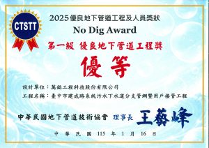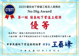 **2025 年優良地下管道工程及人員評選-第一級優良地下管道工程獎(優等)**之殊榮。
